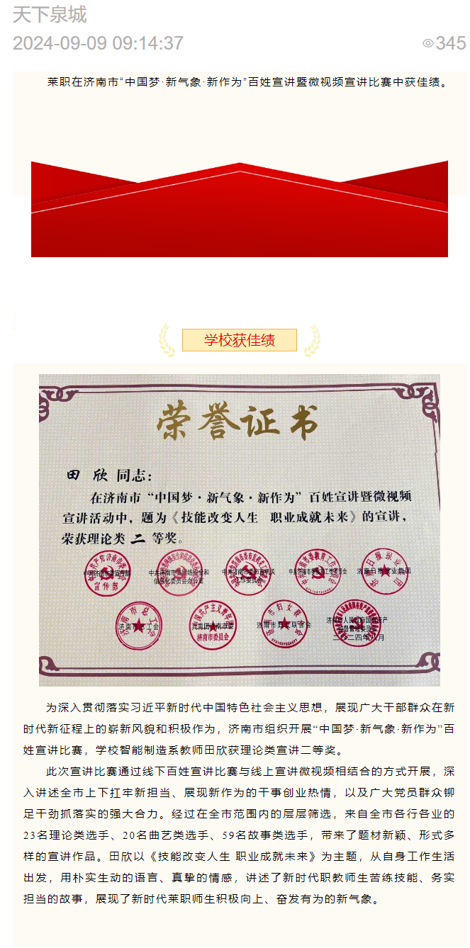 【济南广电】喜报!莱职在济南市“中国梦·新气象·新作为”百姓宣讲暨微视频宣讲比赛中获佳绩
