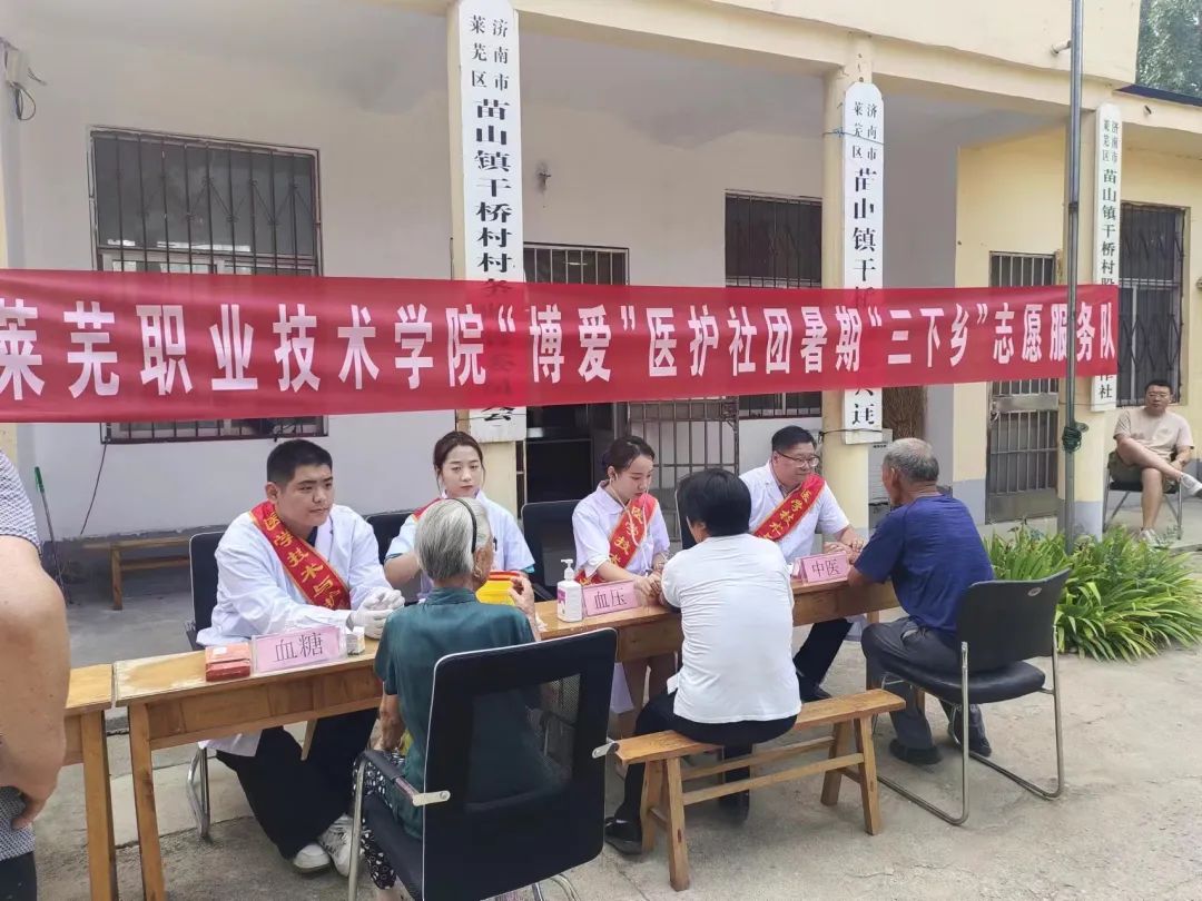 7月11日-13日,医学技术与护理系“博爱”医护社团志愿服务队先后前往济南市莱芜区牛泉镇西牛泉村、茶业口镇高白杨村、苗山镇干桥村,开展了暑期“三下乡”志愿服务活动。