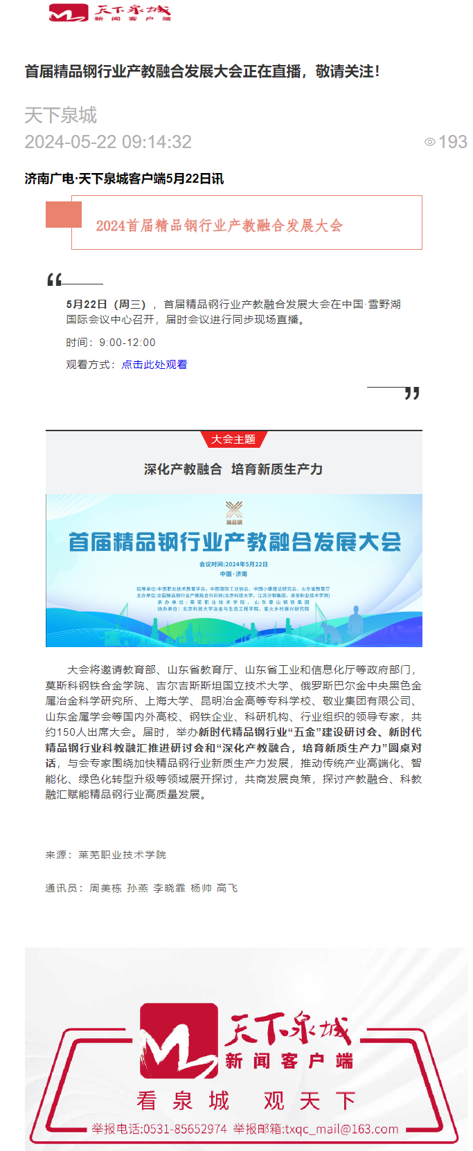 【济南广电】首届精品钢行业产教融合发展大会正在直播,敬请关注!