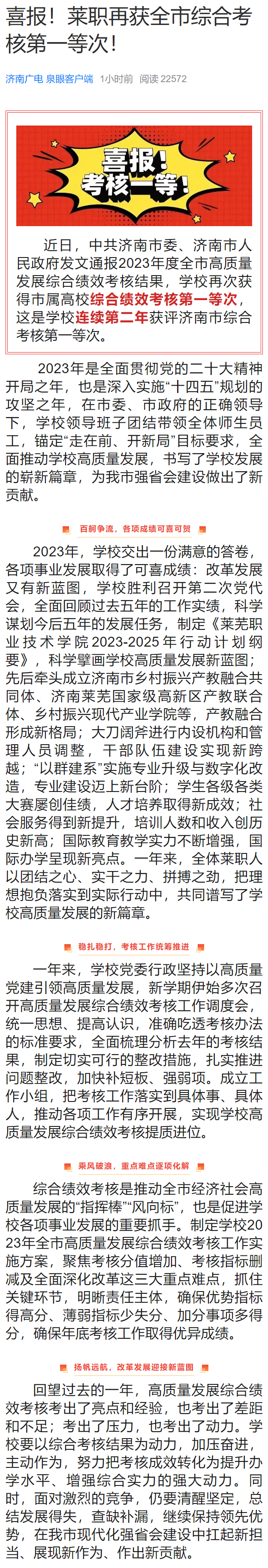 【济南广播电视台】喜报!莱职再获全市综合考核第一等次!
