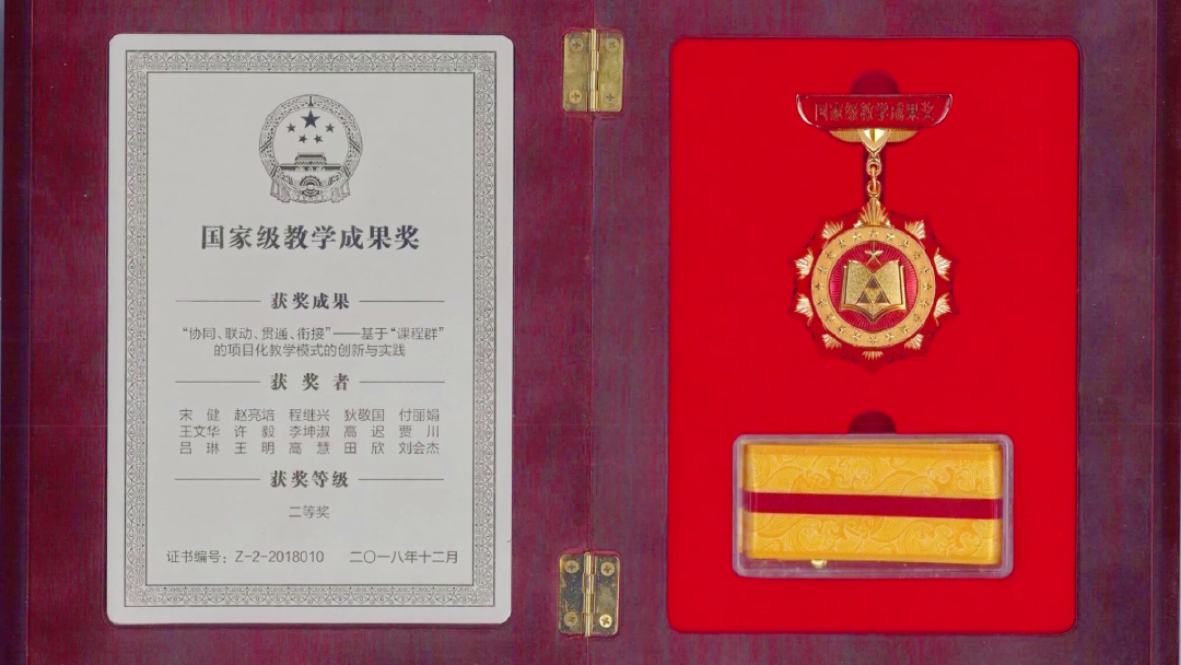 宋健老师主持的《“协同、联动、贯通、衔接”基于“课程群”的项目化教学模式的创新与实践》项目研究工作,从源头上厘清了“校企协同、 整合优化”的一体化课程群建设思路,构建了机电一体化技术专业“提升素养、丰富知识、锻炼技能、拓展创新”“四位一体、交叉融合”的课程群,获得了2018 年职业教育国家级教学成果奖二等奖。