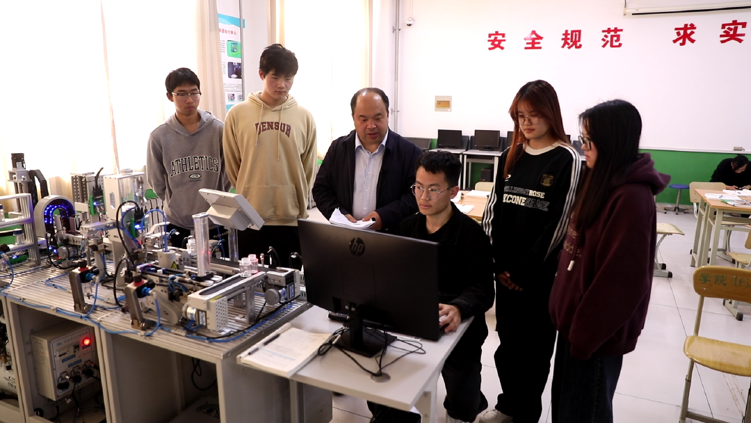 宋健老师正在给学生们讲授的是机电一体化综合实训设备的使用流程及原理。这样的课程内容,对很多人来说都会觉得难懂和深奥,宋健老师也知道这样的原理单纯靠说也不容易说明白,所以每次上课,他都会用直观的教具设备,去讲解理论上的知识。1997年,电气技术专业毕业的大学生宋健来到了beat365在线唯一官网实训处。宋健老师说,当时让他大为惊讶的是,这里的教室,看上去更多的是个工厂的车间。