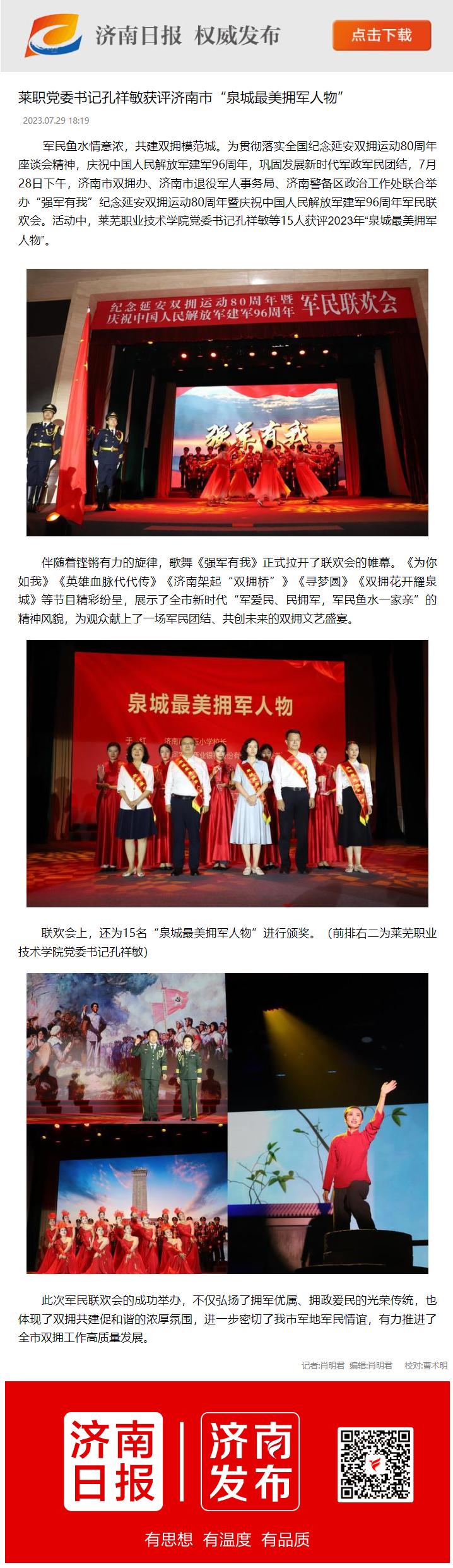 【济南日报】莱职党委书记孔祥敏获评济南市“泉城最美拥军人物”
