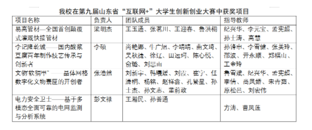 7月14日,第九届山东省“互联网+”大学生创新创业大赛在济南职业学院举办,经过金银奖决赛和金奖排位赛的激烈角逐,学校4个项目全部获得金奖,夺金率百分之百,刷新了学校在历届山东省“互联网+”大学生创新创业大赛的最好成绩。
