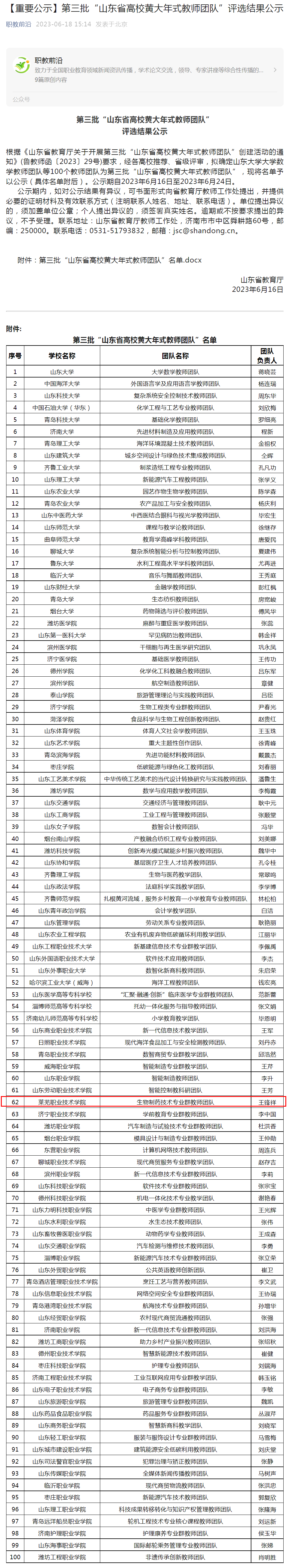 【职教前沿】【重要公示】第三批“山东省高校黄大年式教师团队”评选结果公示