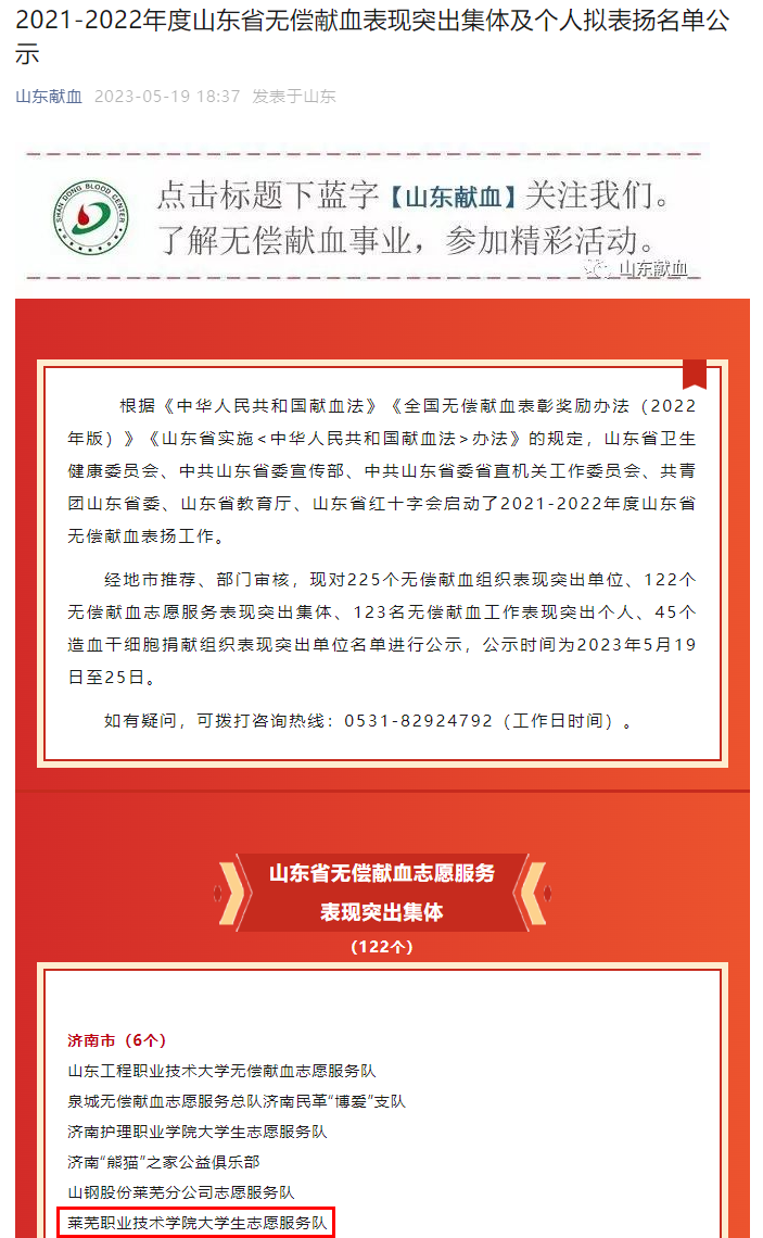 【山东省输血协会】2021-2022年度山东省无偿献血表现突出集体及个人拟表扬名单公示