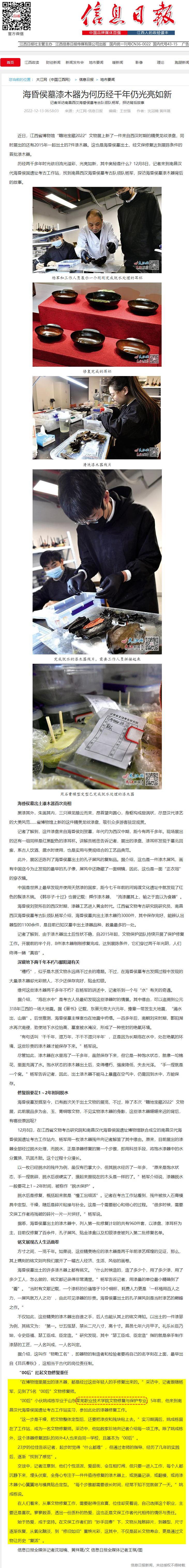 历经两千多年时光依旧流光溢彩、光亮如新,其中奥秘是什么?12月8日,记者来到南昌汉代海昏侯国遗址考古工作站,找到南昌西汉海昏侯墓考古队领队杨军,探访海昏侯墓漆木器背后的故事。