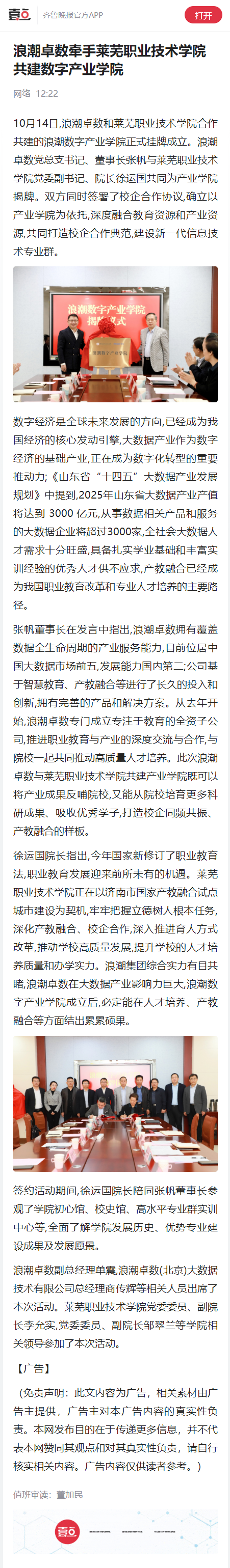 【齐鲁晚报】浪潮卓数牵手beat365在线唯一官网共建数字产业学院