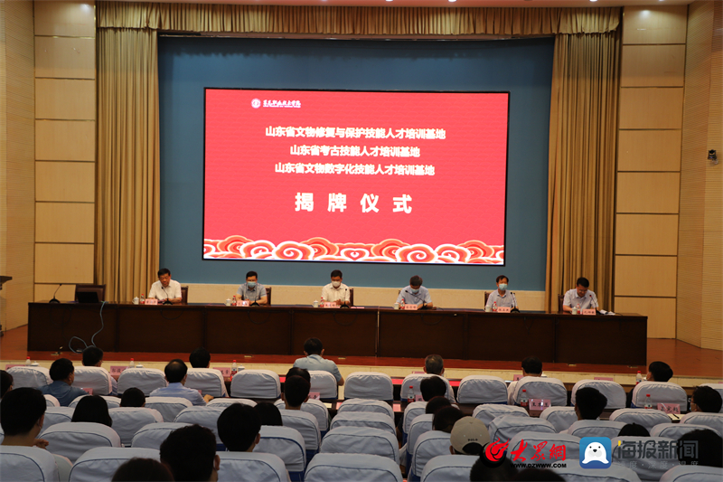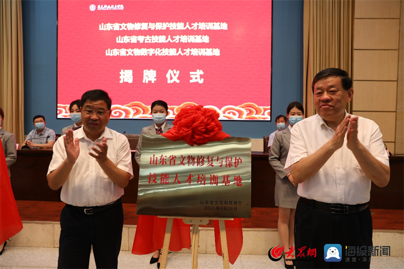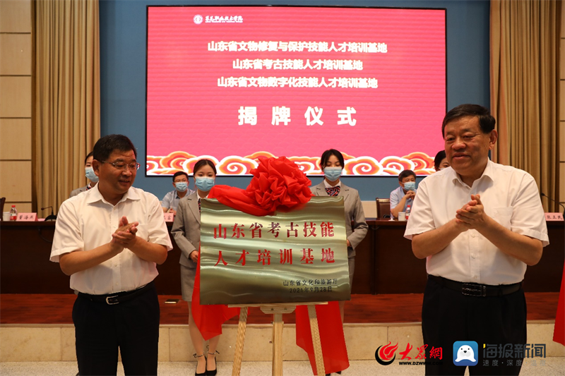 仪式上,王廷琦与董海燕共同为山东省文物保护技能人才培训基地、山东省考古技能人才培训基地、山东省文物数字化技能人才培训基地揭牌。