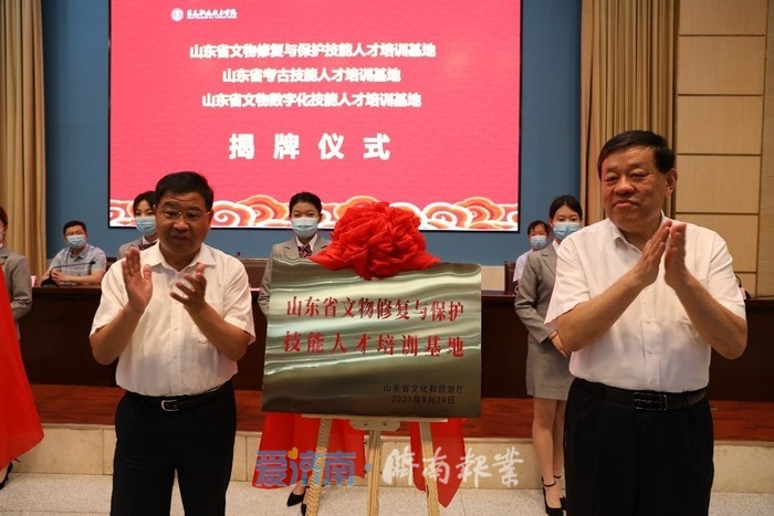 王廷琦与董海燕共同为山东省文物保护技能人才培训基地、山东省考古技能人才培训基地、山东省文物数字化技能人才培训基地揭牌。