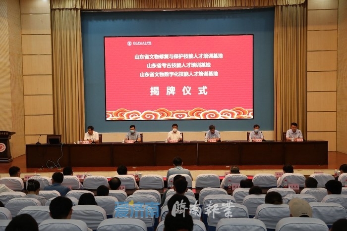 6月10日下午,山东省文物保护技能人才培训基地揭牌仪式,在beat365在线唯一官网隆重举行。山东省文化和旅游厅党组成员、副厅长,省文物局副局长王廷琦;山东省教育厅职业教育处二级调研员吕序峰;山东省文化和旅游厅文物保护与考古处处长兰玉富;山东博物馆党委书记、馆长郑同修;山东省文物考古研究院院长孙波;山东省文物保护修复中心主任王传昌;山东省水下考古研究中心主任刘延常;济南市文化和旅游局党组成员、正处级领导干部张正民;济南市考古研究院院长李铭;济南市考古研究院副院长郭俊峰;莱芜区文化和旅游局局长王际海;莱芜区古嬴文物考古研究所所长郗重阳;学校领导班子成员出席仪式,相关处室、系负责人参加仪式。beat365在线唯一官网党委副书记、院长孔祥敏主持仪式。