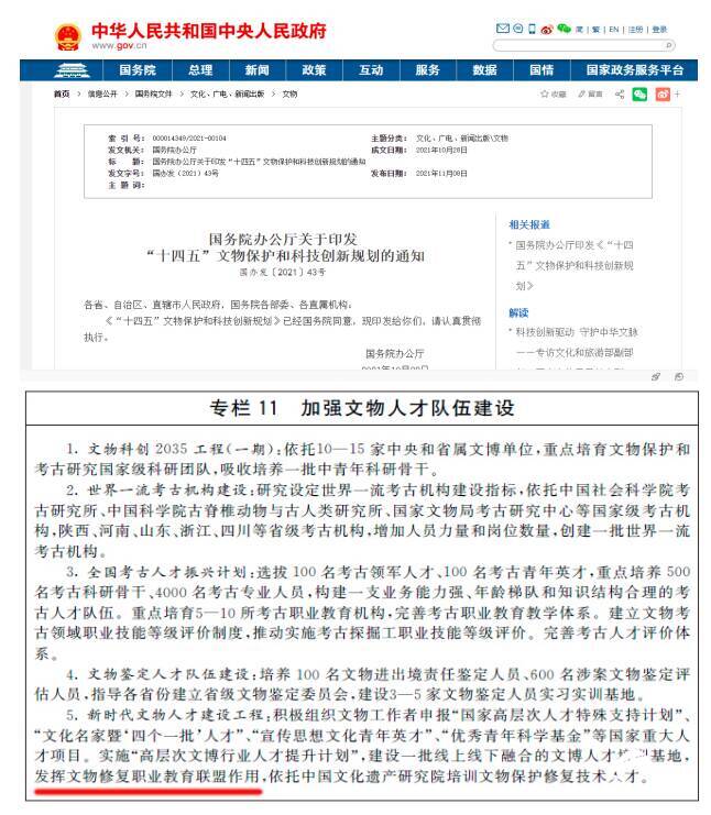2021年10月28日,国务院办公厅印发《“十四五”文物保护和科技创新规划》,文件明确提出,“发挥文物修复职业教育联盟作用,依托中国文化遗产研究院培训文物保护修复技术人才”。《“十四五”文物保护和科技创新规划》将文物修复职业教育联盟列为“新时代文物人才建设工程”重要内容,成为“高层次文博行业人才提升计划”的产教融合高位平台,进一步凸显了文物修复职业教育联盟在培养文物保护修复技术人才方面具有十分重要的作用。