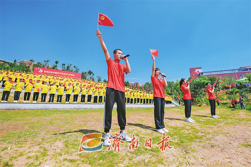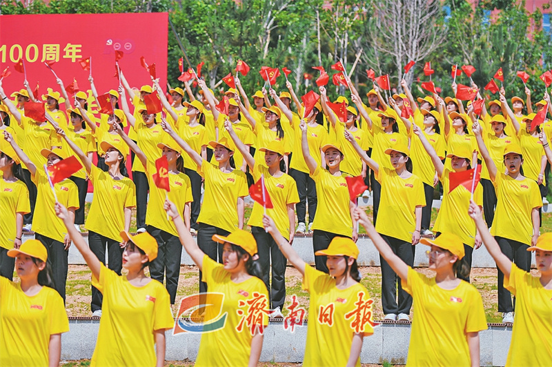 “你看党旗飘扬的方向,有我唯一铁打的信仰。全力以赴春天的梦想,大道直行迎接新的曙光。”同学们挥舞着党旗齐声唱响《党旗飘扬的方向》,这是党史主题教育展开展暨大学生思政教育云平台上线仪式中“感党恩听党话跟党走”汇报演出中的一个环节。