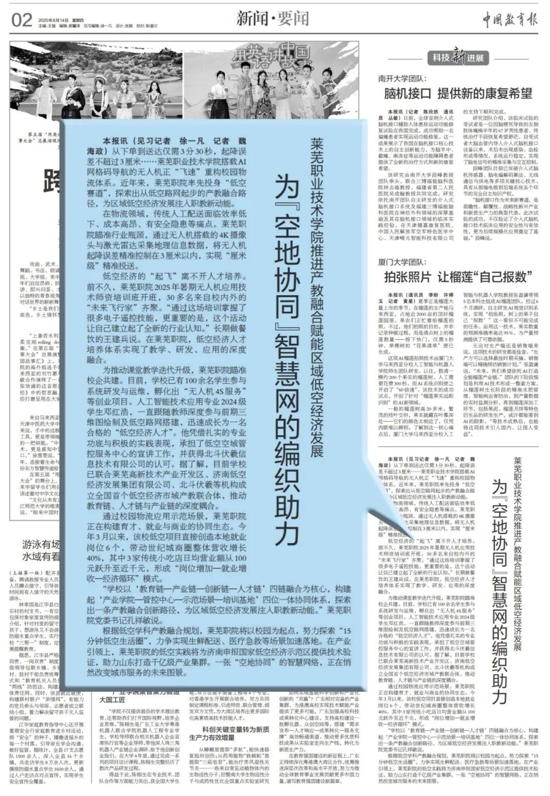 “学校以‘教育链—产业链—创新链—人才链’四链融合为核心,构建起‘产业学院—管控中心—示范场景—培训基地’四位一体协同体系,探索出一条产教融合创新路径,为区域低空经济发展注入职教新动能。”莱芜职院党委书记孔祥敏说。