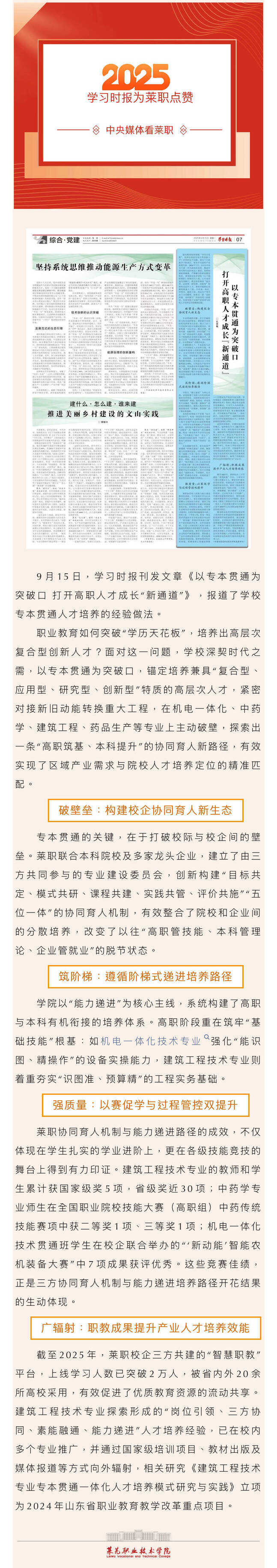 【济南广电】​ 中央媒体看莱职丨学习时报点赞莱职专本贯通人才培养经验做法