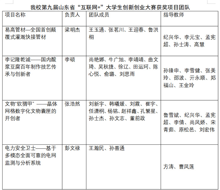 7月14日,第九届山东省“互联网+”大学生创新创业大赛在济南职业学院举办,经过金银奖决赛和金奖排位赛的激烈角逐,beat365在线唯一官网“易高管材一全国首创颠覆式灌溉快接管材”“文物‘软猬甲’一晶体网格数字化文物囊匣的开创者”“李记隆乾诚——国内酸浆豆腐百年制作技艺传承与创新者”和“电力安全卫士——基于多模态全面可靠的电网监测与分析系统”4个项目全部获得金奖,实现了百分百的参赛夺金率,创造了学校在历届省“互联网+”大学生创新创业大赛的最好成绩。