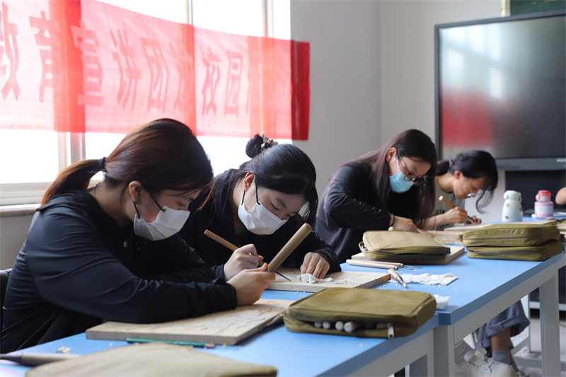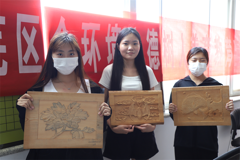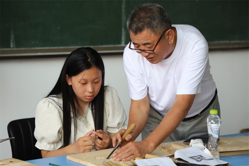 与此同时,邹庆泮在宣讲过程中,向学生们详细宣讲了木雕艺术的传承与发展,传统技艺与技法,邹庆泮言传身教,一丝不苟,学生们饶有兴致,虚心求教,学习热情高涨。通过宣讲,学生基本了解了木雕工艺的基本刻法、有的学生已能刻出简单雏形,达到了既定宣讲目标。