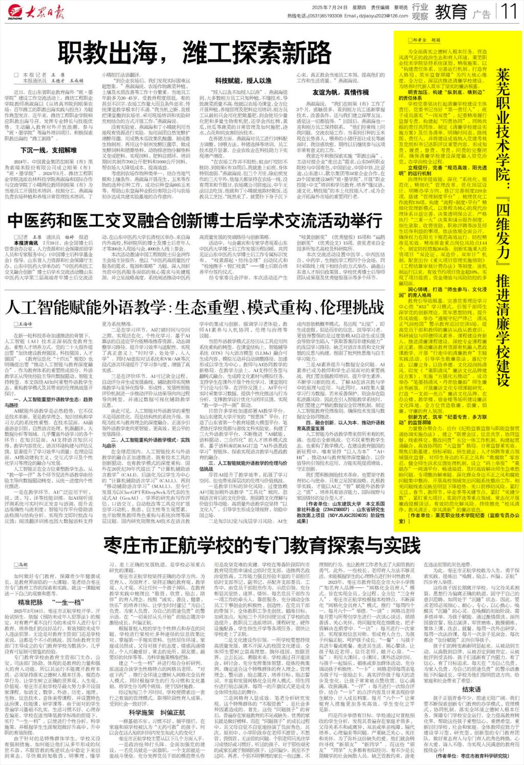 教育引导固根基。完善党委理论学习中心组“853”学习模式,引领干部师生深学党的创新理论,筑牢思想防线,提升作风效能。举办“遵规守纪严律己 清风正气润校园”警示教育巡回宣讲5场,提高党员干部和教师的廉洁从政从教意识、科研诚信与师德师风素养。课程建设育新人。推进清廉课程建设,深挖专业课程廉洁元素,推动廉洁教育资源有机融入思政课教学,开展“行走中的清廉教育”主题实践活动,引导学生敬廉崇法、遵纪守法,以廉立身、以俭养德。文化浸润扬清风。印发《“莱职清风”廉洁文化品牌建设方案》,实施“五强化五推动”。成功举办“笔墨扬清风·丹青绘廉韵”师生廉洁书画展,开展廉洁文化专项课题研究,打造“一支部一亮点”廉洁文化品牌,在办公楼、教学楼、宿舍楼等场所建设廉洁文化阵地,全方位营造敬廉、崇廉、倡廉、守廉的育人氛围。
