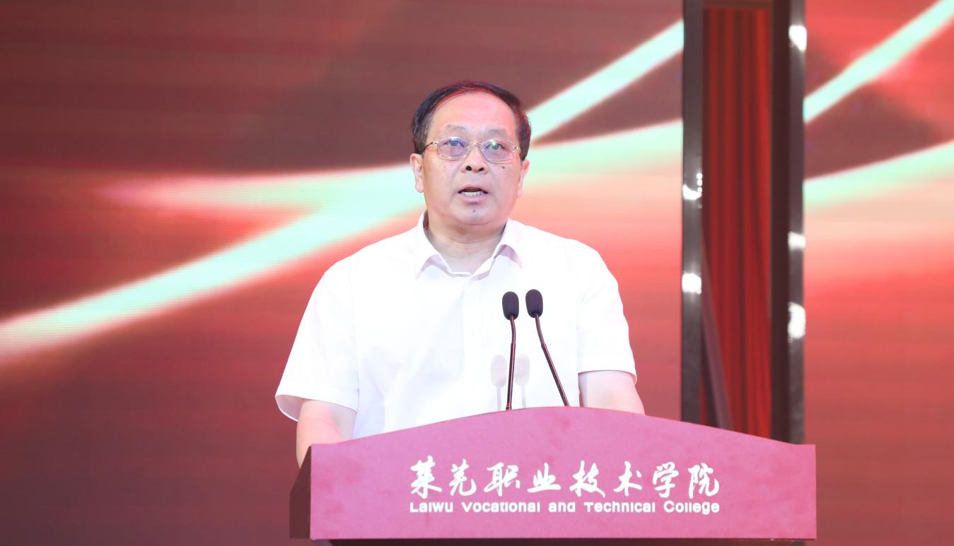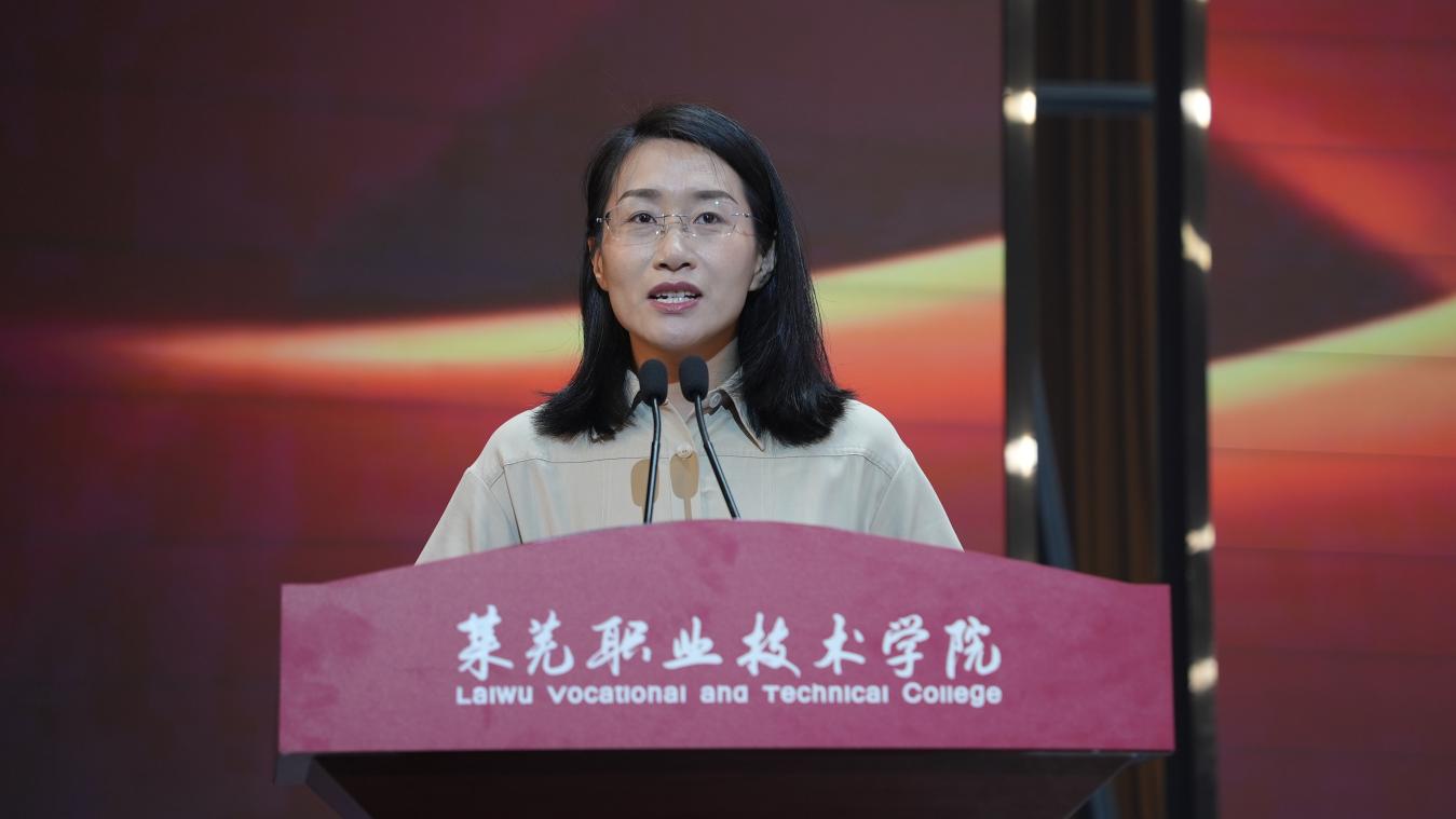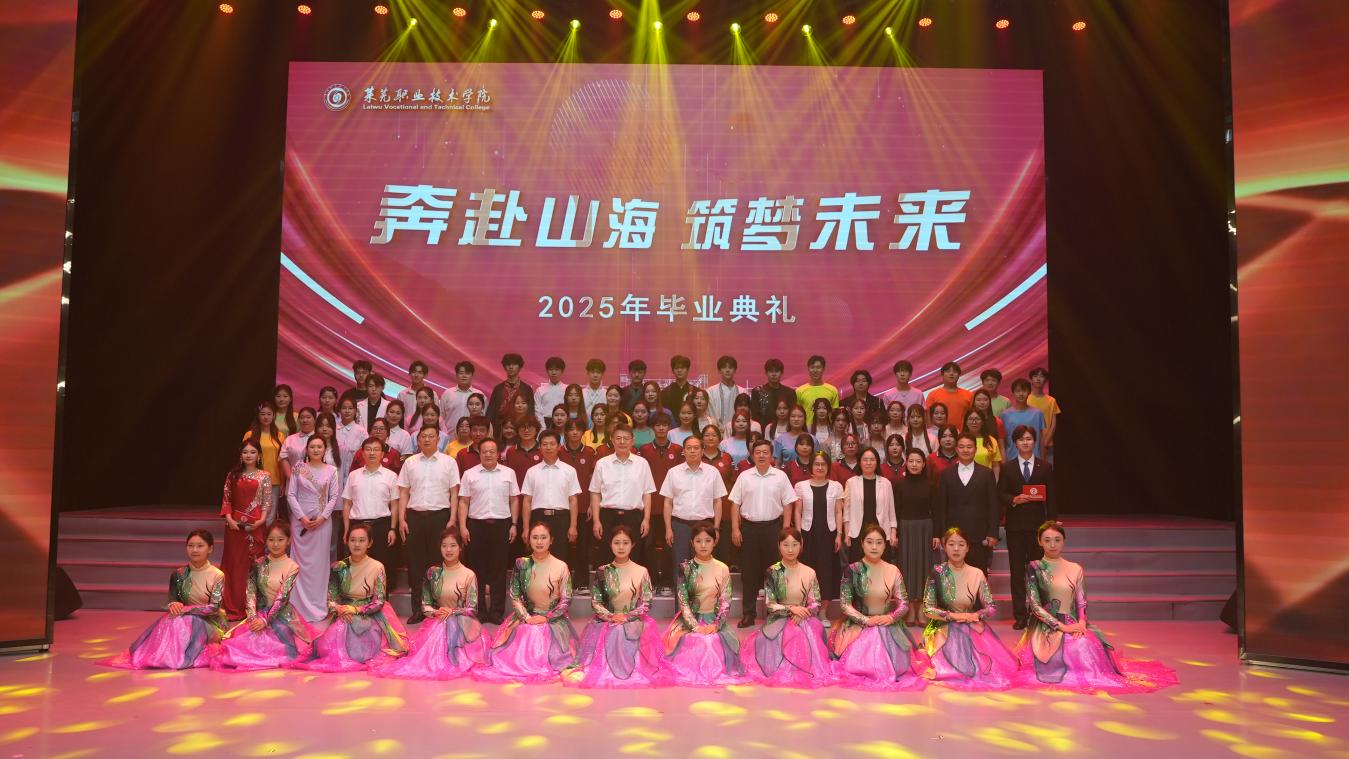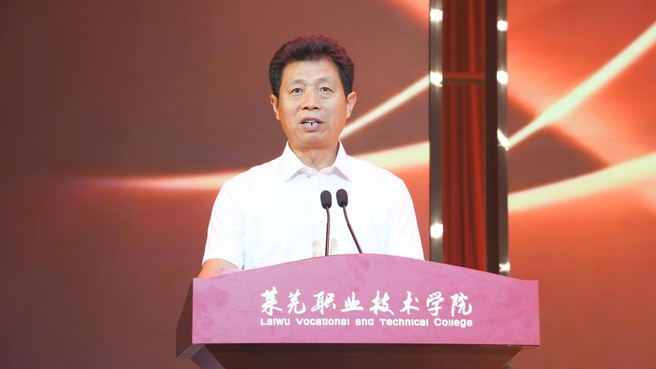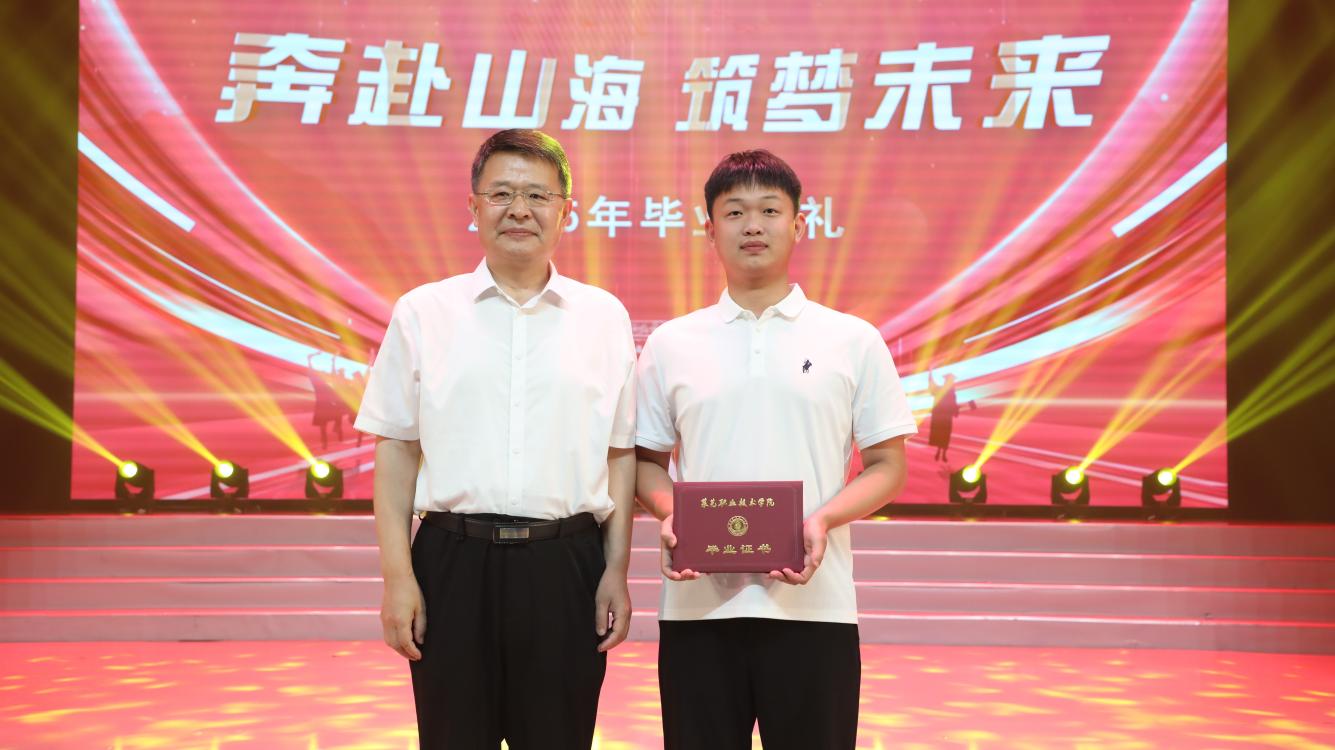 党委副书记、院长徐运国作毕业致辞。他向全体毕业生表示热烈祝贺,向辛勤培育学子的家长、老师致以崇高敬意和诚挚感谢。徐运国回顾了同学们在莱职校园的成长足迹:三年间,他们感悟“感恩 赶超”的校训,传承“德技并修 知行合一”的学风,锤炼品格,追逐梦想,共同参与并见证学校发展的重要时刻——入选山东省“双高计划”拟推荐单位、连续三年获济南市高质量发展综合绩效考核一等次等多项佳绩。他特别列举毕业生亮眼成绩:656名同学升入本科,103名同学光荣应征入伍,335人荣获“学校优秀毕业生”称号,以突出表现为母校增光添彩。他向毕业生提出三点殷切期望:一要融入民族复兴伟业,做“有魂”之人,始终与祖国同频共振,在服务国家、造福社会中镌刻人生价值;二要融入社会发展洪流,做“有用”之人,以莱职培育的创新思维与实践能力为翼,在各行各业开辟新赛道、激发新动能;三要融入终身成长旅程,做“有趣”之人,永葆对生活的热爱与运动的热忱,以蓬勃姿态守护生命趣味,成就幸福人生。