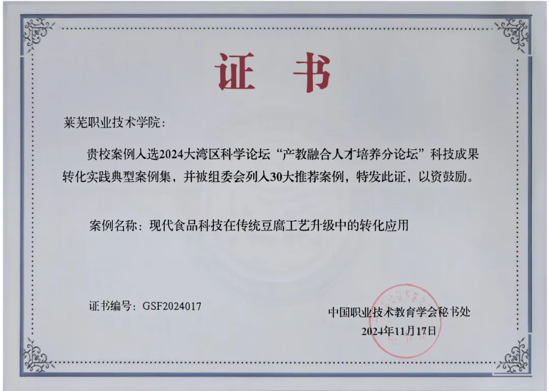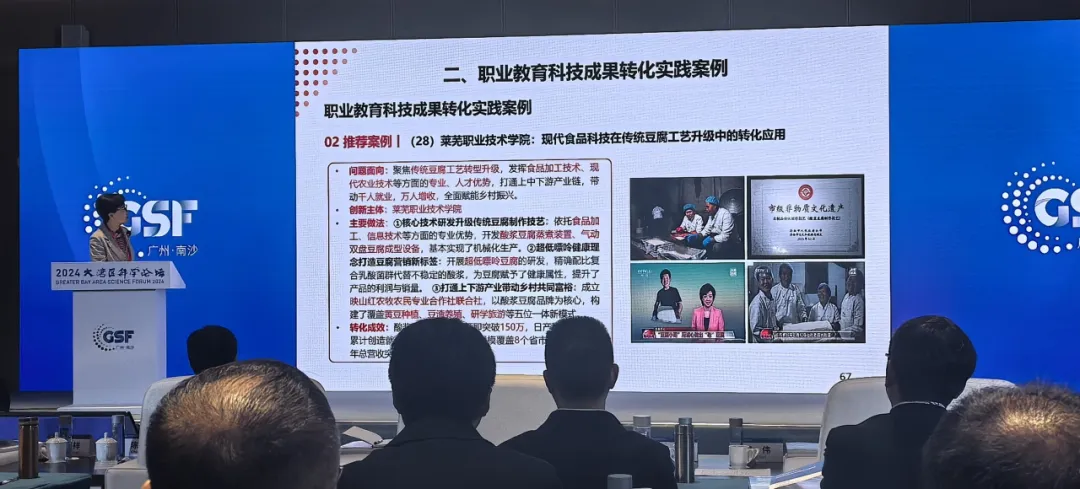 近日,2024年度大湾区科学论坛在广州南沙国际会展中心举行,beat365在线唯一官网申报的案例《现代食品科技在传统豆腐工艺升级中的转化应用》入选2024大湾区科学论坛“产教融合人才培养分论坛”科技成果转化实践典型案例集,并被组委会列入30大推荐案例。中国职业技术教育学会会长、教育部原副部长鲁昕在主旨报告中对beat365在线唯一官网推荐案例进行了展示,并为学校颁发证书。