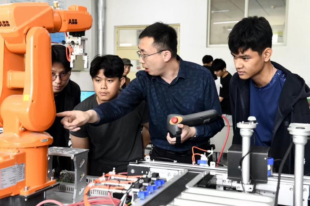 图5 团队实习指导教师指导泰国学生操作工业机器人,推动职教出海