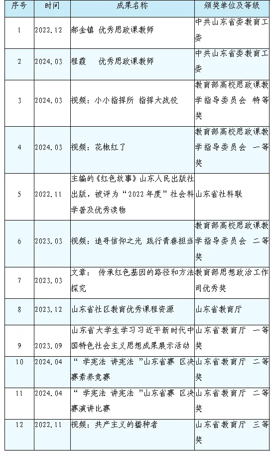 团队成员以专职思政教师为主,基地及企事业单位兼职教师为辅。专职思政教师中,教授4名,副教授5名,讲师1名,助教14名,职称结构合理。50岁以上教师6人,40岁以上教师4人,30岁以上教师15人。团队无论是职称还是年龄,形成梯队结构。老教师教学经验丰富,对教材把握较深刻,对学生特点了解较透彻;新教师思维活跃,信息技术娴熟。合理的教学梯队易于发挥各自特长,教学科研相互取长补短,共同成长。团队成员中,山东省骨干教师1人,山东省宣讲先进个人1人,山东学校优秀思政课教师3人。主持省级以上教学课题多项,省级教学课题获奖多项。教学中坚持“八个相统一”、科学施教,课堂教学、实践教学、网络教学相互结合,触动学生心灵,引导学生实现理论认同。