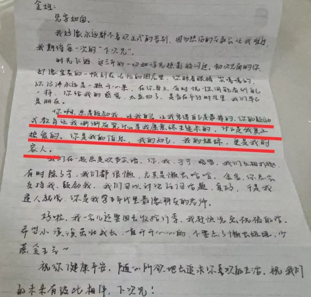 团队教师始终坚持走进学生身边,更走进学生心田,以心交心,以情暖情。下面是学生写给团队思政课教师的亲笔信:“老师啊,您总是鼓励我、让我自信,让我觉得自己是最棒的,你的鼓励或教育让我明白什么是我愿意终生追求的、什么是我热爱的,你是我的伯乐、我的知己、我的姐妹、更是我的家人”。如此双向奔赴的师生情谊,让我们暖心更感动。思政课从来不仅仅是理论的传授,更要培根铸魂启智润心。