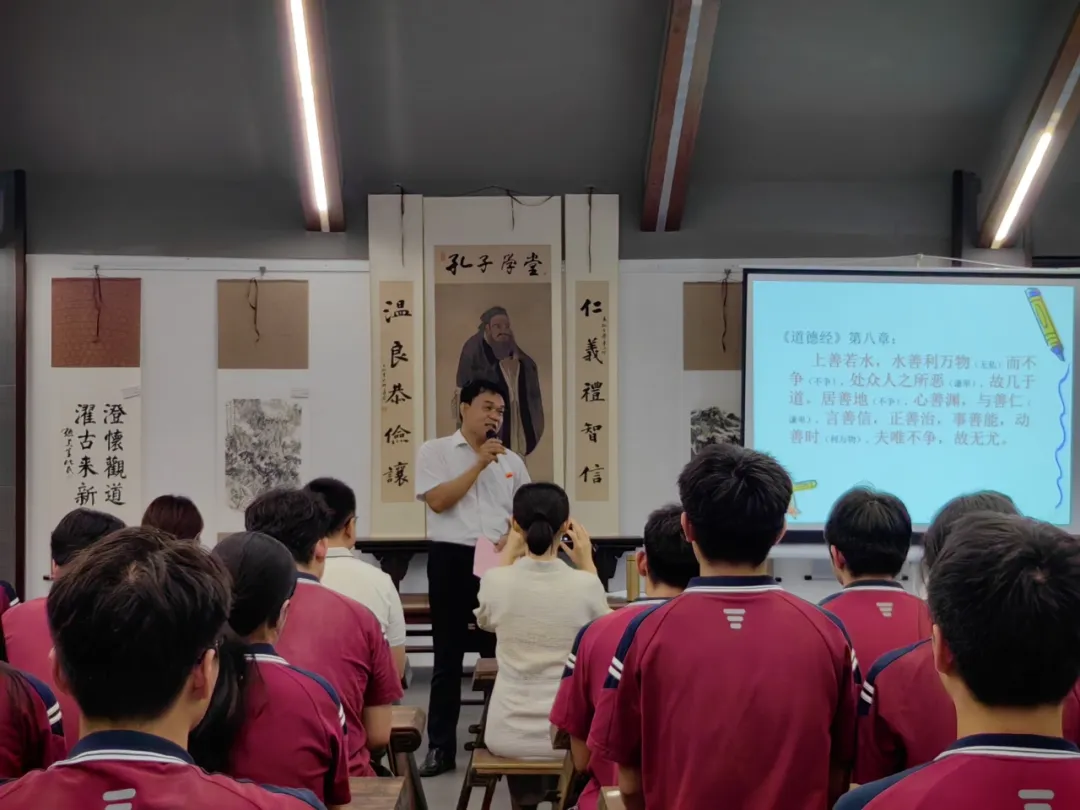 随后,师生们落座孔子学堂,聆听汶源书院专家顾问、教育系教授李建作传统文化讲座。李建以《学习传统文化,提升人文素养》为题,从为什么读书和怎样读书、为什么要学习中华优秀传统文化以及对中国人影响最大的三本书——《论语》《道德经》《易经》三个方面展开阐述,勉励同学们要利而不争、宽以待人,做到“上善若水”。通过学习传统文化,汲取先辈们宝贵的精神财富,增强民族认同感和文化认同感,不断提升民族自豪感和文化归属感。李建老师的讲座深入浅出、诙谐幽默、明体达用,为师生们奉献了一场传统文化的饕餮盛宴。