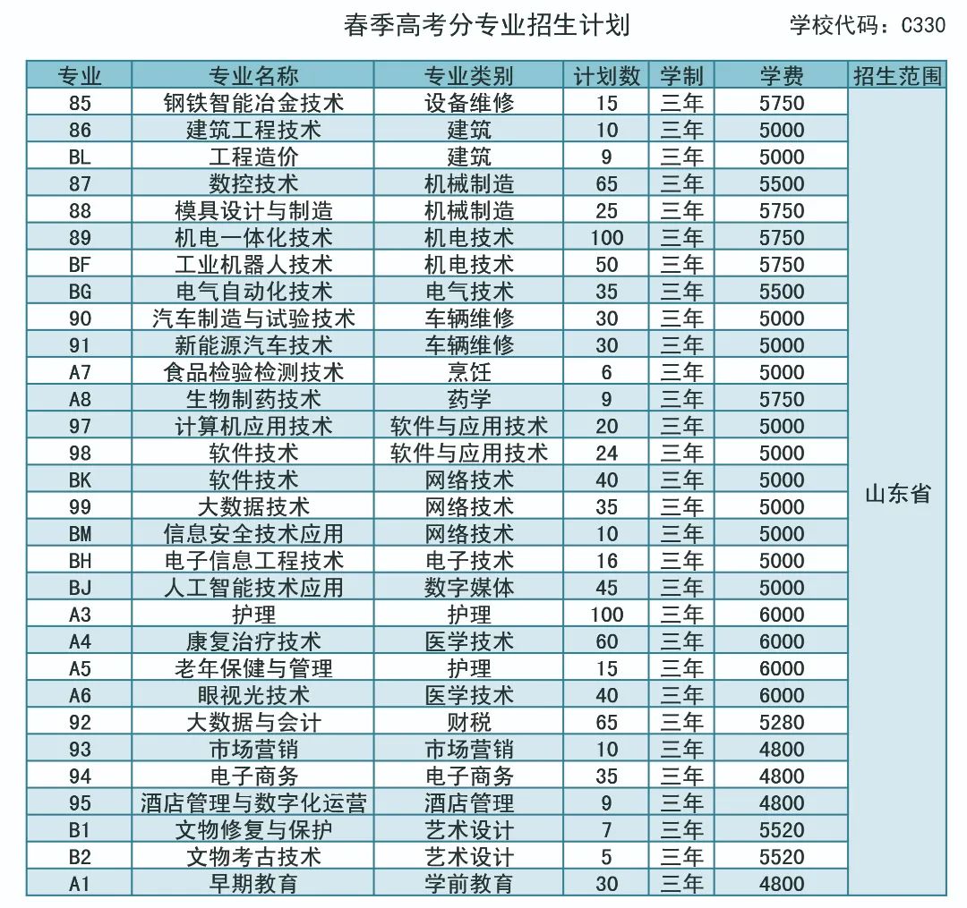 春季高考分专业招生计划