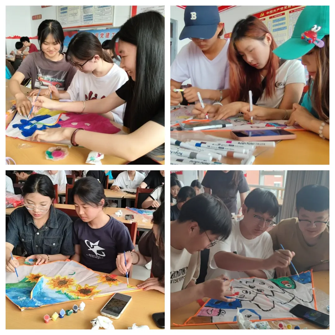 同学们进行风筝插装及绘制,3人一组,分组设计绘制,在空白的风筝上画出内容不同形式各异的图案内容,表达对青春的理解及对生活的热爱。同学们对所绘内容各抒己见,畅所欲言,绘画时互帮互助,彼此交到了新朋友,获得愉快的绘画体验。