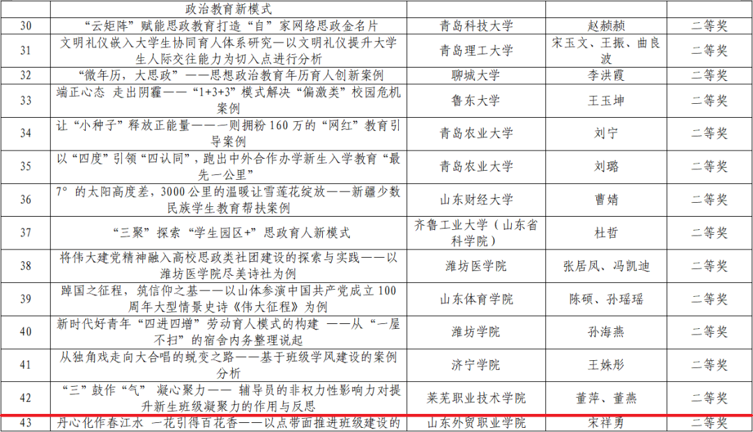 近日,由山东省委教育工委组织开展的全省高校辅导员创新工作2022年度优秀案例评选结果揭晓。学校报送的《“三”鼓作“气” 凝心聚力——辅导员的非权力性影响力对提升新生班级凝聚力的作用与反思》工作案例获二等奖。