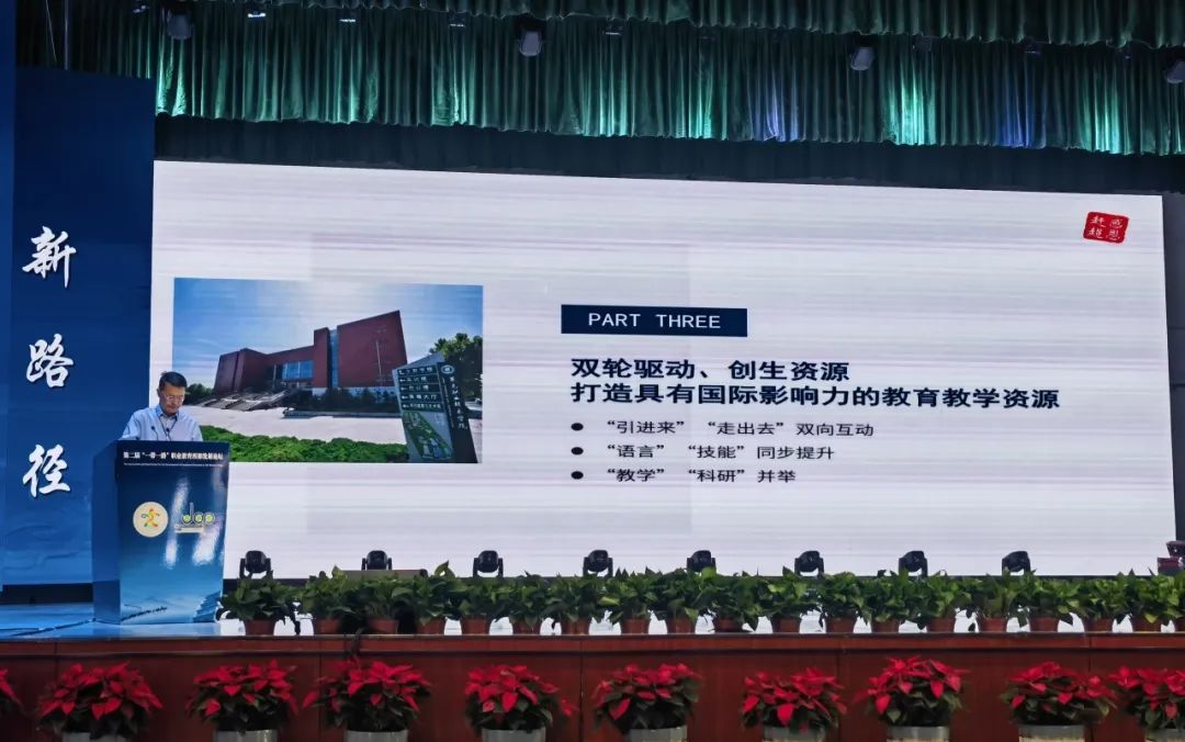 孔祥敏以“‘四维联动’推动国际化建设,打造服务‘一带一路’莱职样板”为主题,分享了学校推进国际化办学,服务“一带一路”建设的经验做法。他指出,自2018年以来,学校锚定山东新旧动能转换、黄河流域高质量发展等战略,服务区域经济开放发展,依托3个高水平建设专业群,引、输、融、创,通过“搭平台、融资源、输标准、强师资”四个维度联动,培养掌握中国技术标准、拥有跨文化交际能力的国际化技术技能人才,服务“走出去”企业人才需求、促进人文交流,打造国际化莱职样板。牵头成立了东南亚职业教育境外办学联盟,与海尔、中国重汽、泰山钢铁等跨国企业合作,共建海外分校、华文教育基地。制定中泰机电一体化技术专业人才培养方案,通过汉语桥线上团组项目,输出培训课程资源,两门课程获泰国教育部职业教育委员会曼谷中心认证,在22所泰国职业院校推广应用。承接教育部语合中心“中文+职业技能”教育教学资源开发项目2项,首次将语言能力提升与职业能力培养融合到一套教材中去。构建了数字化、模块化、多语种的育训研创课程体系,建设了12门双语课程。