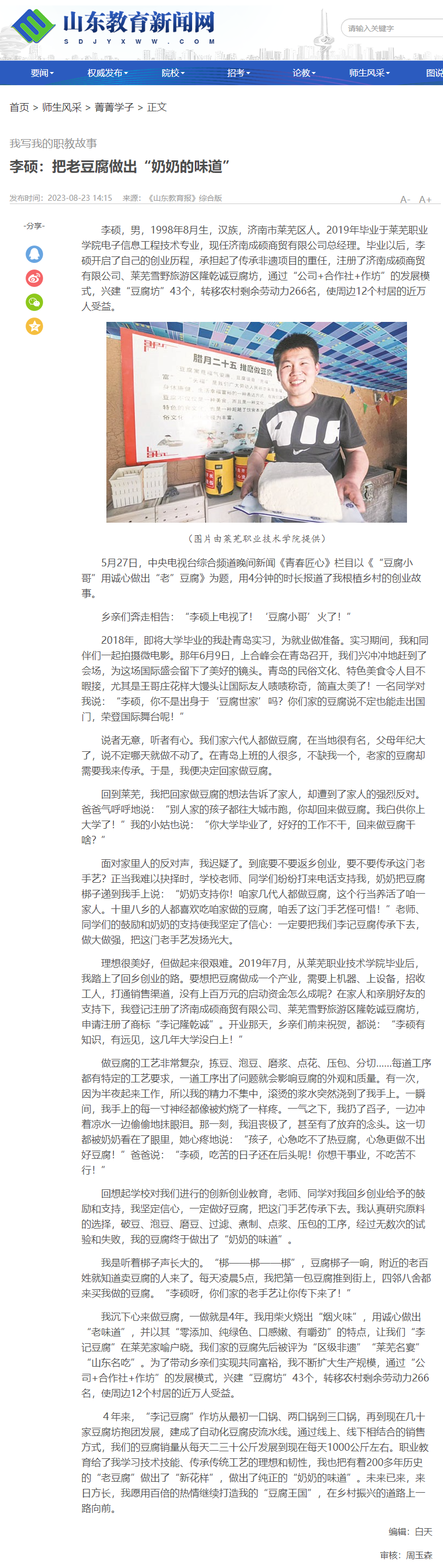 【山东教育新闻网】我写我的职教故事|李硕:把老豆腐做出“奶奶的味道”