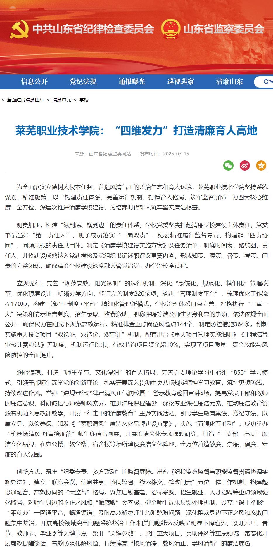 润心铸魂,打造“师生参与、文化浸润”的育人格局。完善党委理论学习中心组“853”学习模式,引领干部师生深学党的创新理论。扎实开展深入贯彻中央八项规定精神学习教育,筑牢思想防线,持续改进作风。举办“遵规守纪严律己清风正气润校园 ”警示教育巡回宣讲5场,提高党员干部和教师的廉洁意识、科研诚信与师德师风素养。推进清廉课程建设,深挖专业课程廉洁元素,推动廉洁教育资源有机融入思政课教学,开展“行走中的清廉教育”主题实践活动,引导学生敬廉崇法、遵纪守法,以廉立身、以俭养德。印发《“莱职清风”廉洁文化品牌建设方案》,实施“五强化五推动”。成功举办“笔墨扬清风·丹青绘廉韵”师生廉洁书画展,开展廉洁文化专项课题研究,打造“一支部一亮点”廉洁文化品牌,在办公楼、教学楼、宿舍楼等场所建设廉洁文化阵地,全方位营造敬廉、崇廉、倡廉、守廉的育人氛围。