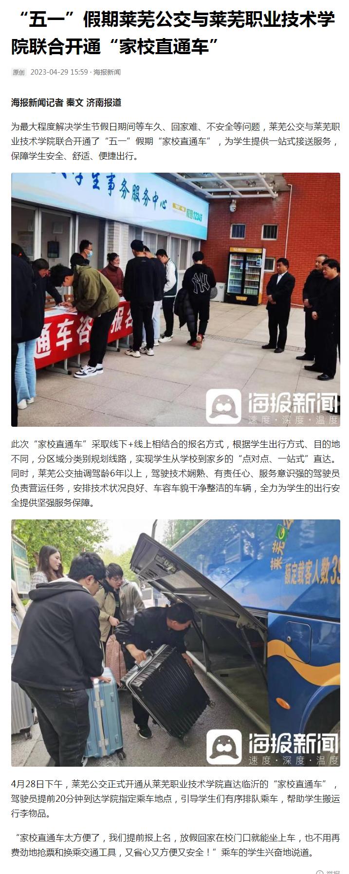 【今日头条】“五一”假期莱芜公交与beat365在线唯一官网联合开通“家校直通车”