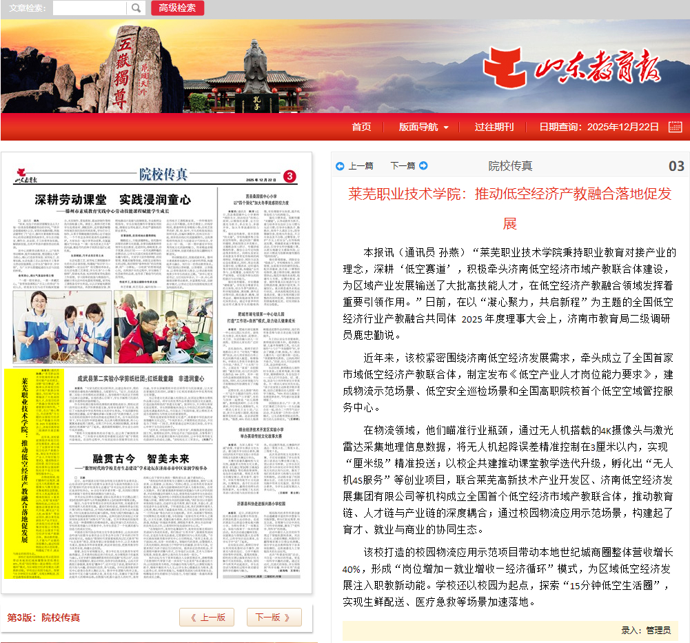 在物流领域,他们瞄准行业瓶颈,通过无人机搭载的4K摄像头与激光雷达采集地理信息数据,将无人机起降误差精准控制在3厘米以内,实现“厘米级”精准投送;以校企共建推动课堂教学迭代升级,孵化出“无人机4S服务”等创业项目,联合莱芜高新技术产业开发区、济南低空经济发展集团有限公司等机构成立全国首个低空经济市域产教联合体,推动教育链、人才链与产业链的深度耦合;通过校园物流应用示范场景,构建起了育才、就业与商业的协同生态。