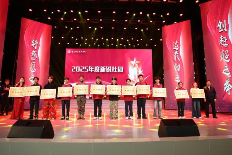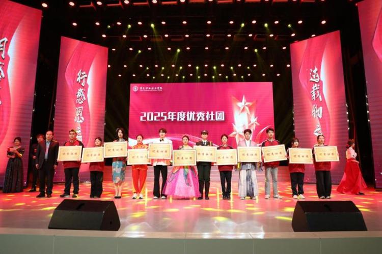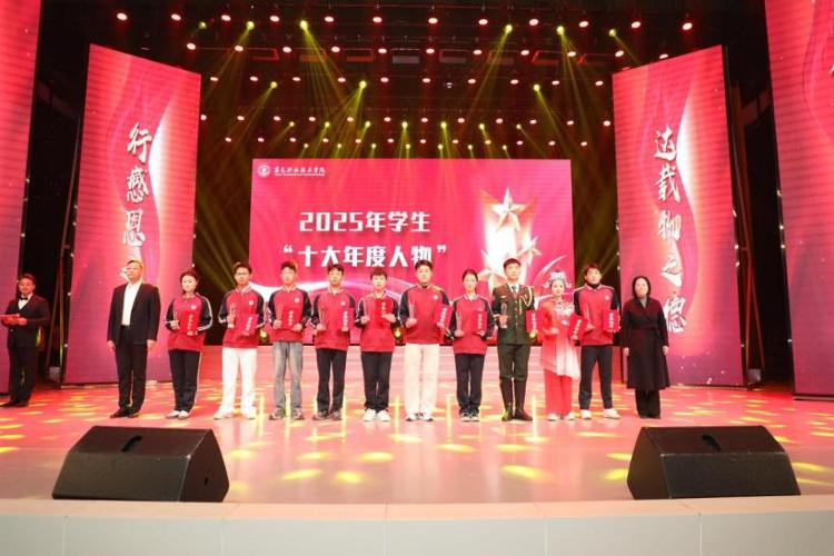晚会现场颁发2025年学生“十大年度人物”“一站式”学生社区第十七届宿舍劳动文化节优秀组织奖、心理健康教育月特色活动优秀组织奖、“感恩校园 报恩思进”主题活动优秀组织奖、2025年度新锐社团及优秀社团等多个奖项。校领导为获奖个人与集体颁奖,勉励全体学子以榜样为标杆,在勤学善思、躬身实践中锤炼本领、成长成才。