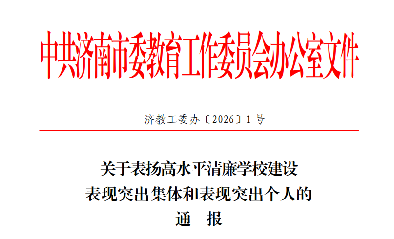 近日,中共济南市委教育工委印发《关于表扬高水平清廉学校建设表现突出集体和表现突出个人的通报》(济教工委办〔2026〕1号),beat365在线唯一官网荣获“高水平清廉学校建设表现突出集体”称号,纪委(监察专员办公室)的李太公同志荣获“高水平清廉学校建设表现突出个人”称号,这是学校持续深化全面从严治党、扎实推进清廉学校建设取得的重要成果。