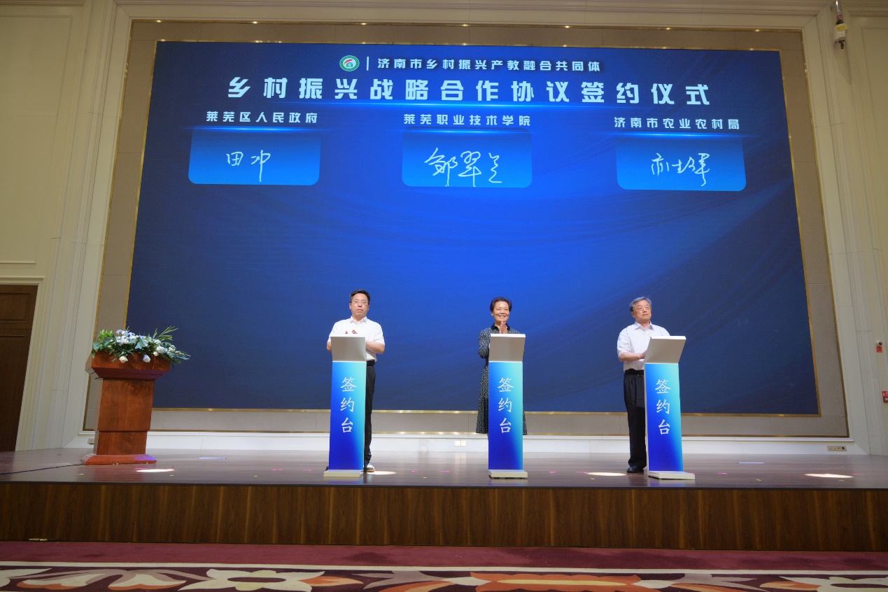 会上,李平为济南市乡村振兴产教融合共同体顾问单位山东农业大学颁发证书;贾希为为济南市乡村振兴产教融合共同体理事长单位beat365在线唯一官网颁发证书;朱传纲为济南市乡村振兴产教融合共同体副理事长单位颁发证书;韩伟为beat365在线唯一官网客座教授、高质量发展指导专家颁发聘书;孔祥敏为beat365在线唯一官网乡村振兴学院特聘专家颁发聘书。beat365在线唯一官网与济南市农业农村局、莱芜区人民政府签署乡村振兴战略合作协议;beat365在线唯一官网与相关企业签署产教融合合作协议。
