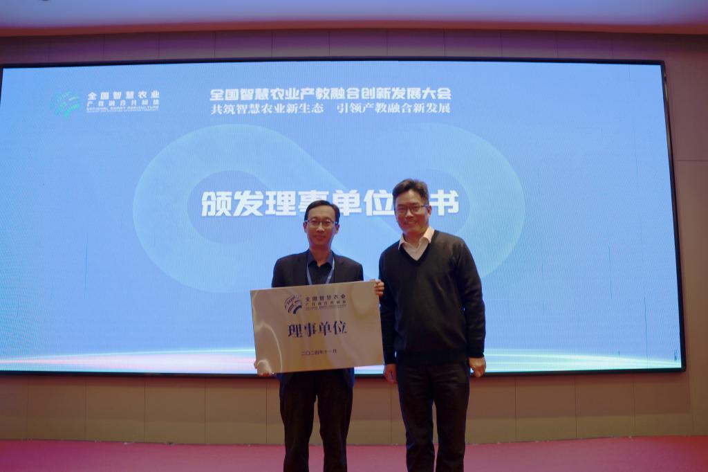 在会议中,beat365在线唯一官网正式被授予全国智慧农业产教融合共同体理事单位的身份。科研处处长郑福山出席并领取了理事单位的牌匾。