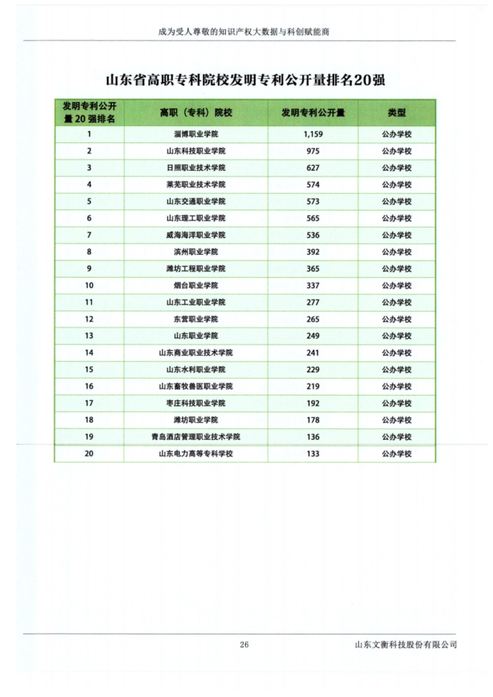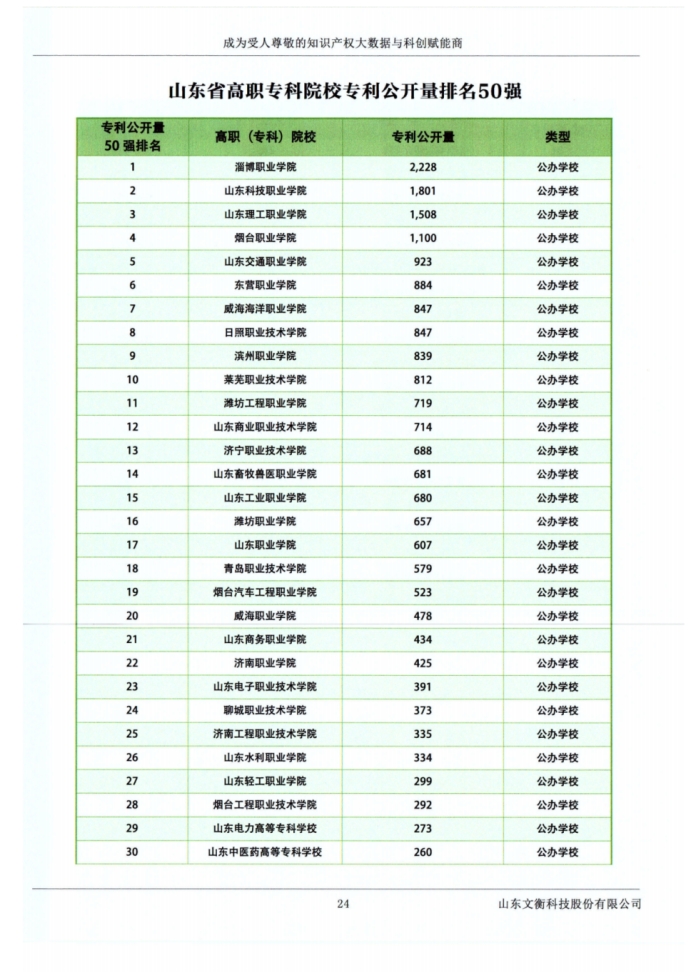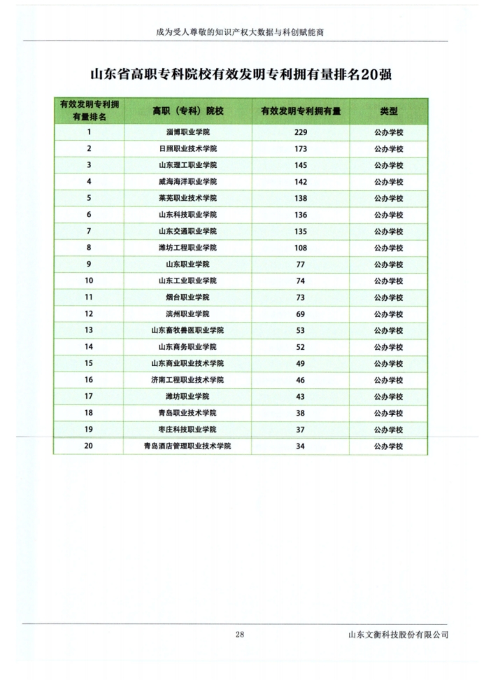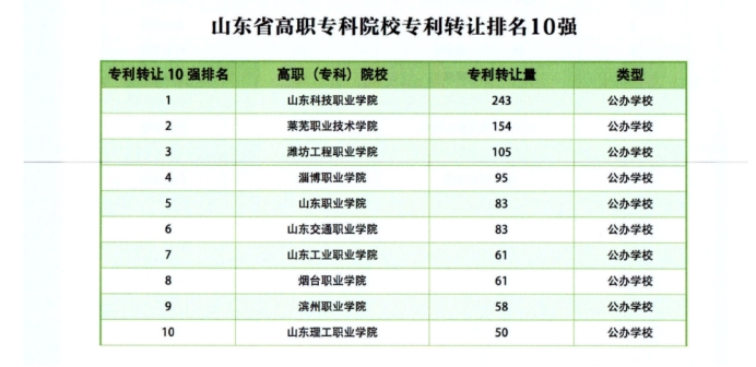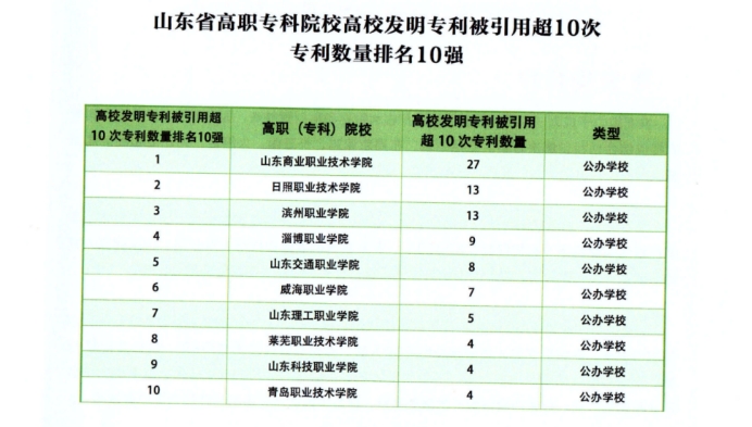 近日,由山东省高等教育管理科学研究会等机构组织的2024年度“科教融汇山东省高校专利榜单”发布。学校多项指标位居山东省高职院校前列,其中专利转让量排名山东省第2位,发明专利公开量排名第4位,有效发明专利拥有量排名第5位,专利被引用超10次专利数量排名第8位,专利公开量排名第10位。这些成绩凸显了学校在科技创新和知识产权保护方面的显著进步和优势。