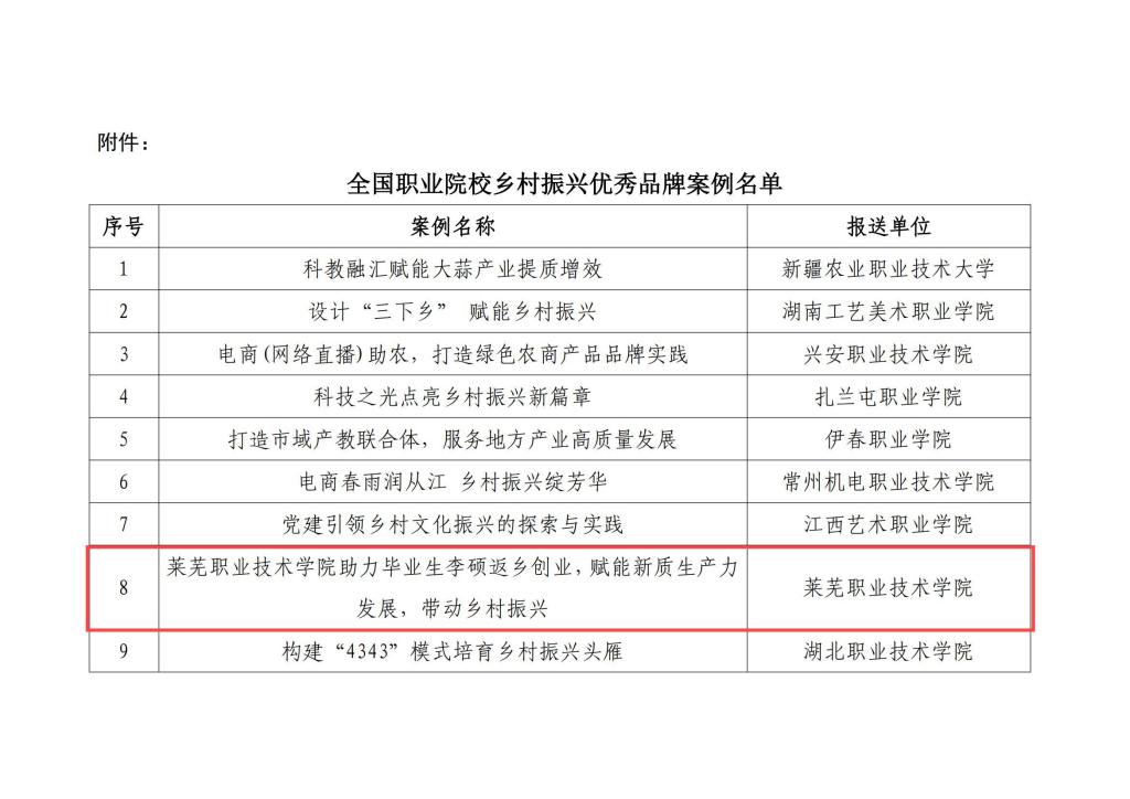 此次入选优秀品牌案例,是对学校服务乡村振兴工作的高度认可。近年来,学校坚持产教融合、科教融汇,积极探索“职业教育+产业赋能”路径,通过人才培养、技术支持、创业孵化等举措,为乡村发展注入新活力。未来,学校将以此次获奖为契机,进一步发挥职业教育优势,深化校地合作,培养更多适应乡村振兴需求的高素质人才,持续打造可复制、可推广的职教赋能乡村振兴模式,为推动地方经济发展和乡村全面振兴贡献更多“莱职力量”。