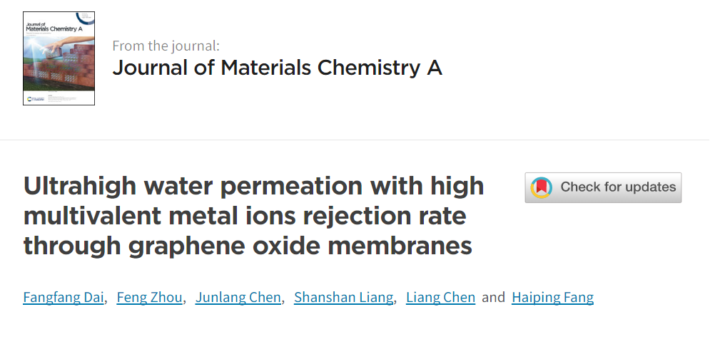 近日,PP电子理学院物理系研究团队在国际知名刊物《Journal of Materials Chemistry A》(影响因子11.301),在线发表了最新研究成果“Ultrahigh water permeation with high multivalent metal ions rejection rate through graphene oxide membranes”。该工作通过探究高价态金属离子水合结构在氧化石墨烯膜通道内的结构型变的物理机理,实现了对高价态离子在保持高截留率的同时实现超高水通量的应用,具有良好的工业化应用前景。