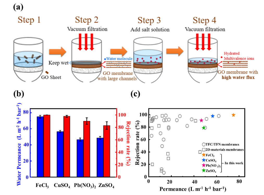 近日,PP电子理学院研究团队与浙江农林大学、浙江省辐射环境监测站合作,通过对高价态金属离子水合结构在氧化石墨烯膜受限空间内的物理机制的理解,提出优化氧化石墨烯膜的制备过程的方法。制备得到的氧化石墨烯膜在对高价态离子截留时,保持了非常高的高价态离子截留率(为99.9 ± 0.1%),同时水通量可达75 ± 2 L m−2 h−1 bar−1,超越所有现有报道的传统的纳滤膜以及其他先进的二维膜在处理高价态离子时的水渗透性能,突破了此前方法得到的氧化石墨烯膜在离子截留率和选择性的瓶颈。