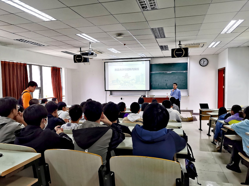 随后,郑老师从21级新生录取通知书上的新技术“光控变色校徽”的材料讲起,娓娓道来液晶材料技术的发展。他不仅为同学们讲解了液晶材料的相关知识和研究内容,更是描绘了液晶材料在高集成光子芯片、高速光计算、光量子通讯等领域的广阔的前景以及物理专业学生毕业后广阔的就业市场,为在场的学生送上了一份学术大餐。