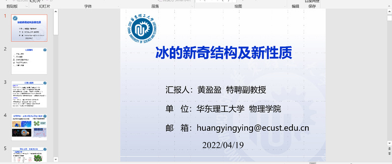 黄盈盈老师以“冰的新奇结构”为题,从水冰的广泛分布性和重要性引入,简述了水冰具有多种反常性质,进而向同学们介绍了她所在课题组及其合作课题组研究工作的三项重要突破:其一是负压下低密度冰相的研究取得新进展,理论预言了笼形冰相的存在,黄盈盈老师表示这意味着未来有可能填补中国在发现新冰相的空白,取得历史性突破;其二是理论预测了一个超低密度多孔负压冰相并重新绘制了其在负压下的相图,丰富了同学们对固体冰相的认识;其三是理论预测了一个高密度铁电新冰相。最后,黄盈盈老师向同学们介绍了低密度冰新奇结构在气体储存、设计新能源材料等领域的重要应用。