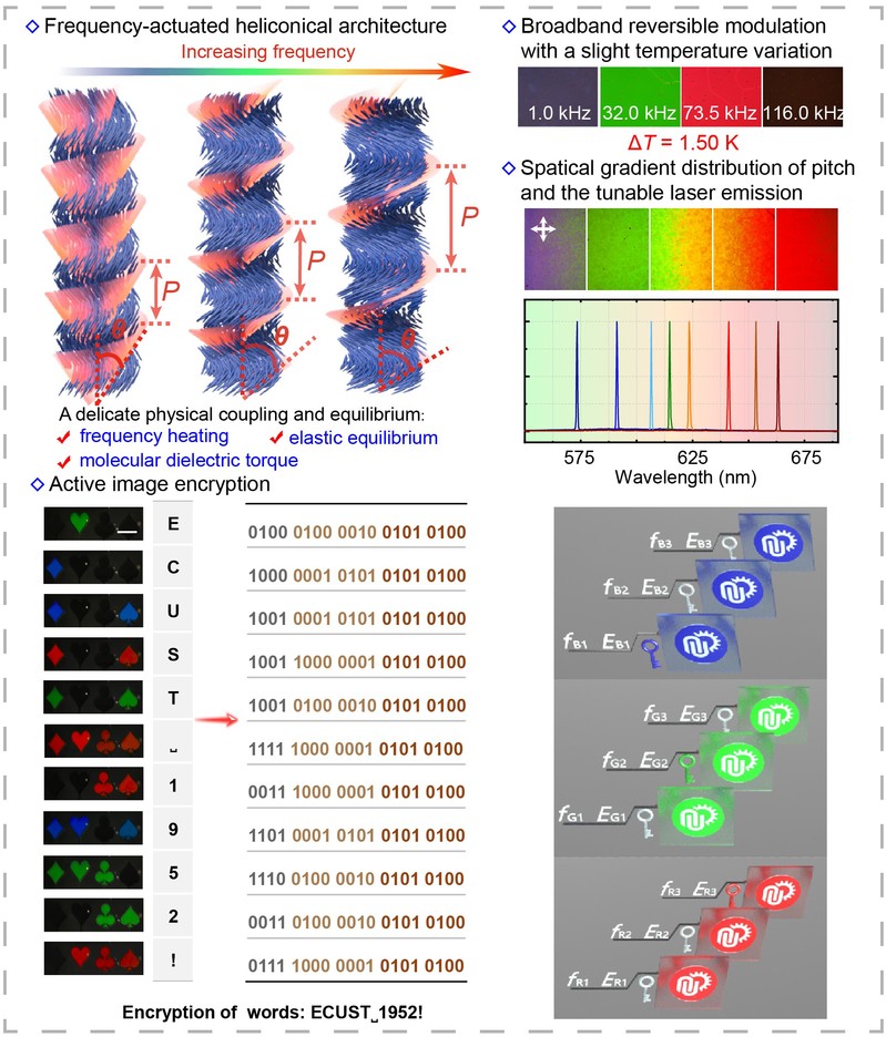 信号频率驱动光学微结构对当代先进光子学和光学工程的发展有着重要意义。利用软物质体系的频率响应特性可实现宽动态范围的螺旋结构调制,然而这种调控机制的的突出的问题是高频热效应给器件实际应用带来的严峻挑战。胆甾相液晶是一类具备自组装螺旋微结构的光学软材料,具有出色的刺激响应特性。对于某些特定的胆甾相液晶体系可以通过调节所施加电场的频率来实现相态的切换及螺旋结构螺距调制。例如在离子型液晶体系中,增大电场频率,可以形成均匀排列的平面织构,而降低电场频率,会转变为光散射态;在双频液晶中,调节电场频率可实现对直角螺旋结构的螺距及光谱的调制,然而实现光谱宽动态范围调制通常需要兆赫兹级的高频电场,这种高频信号驱动通常将导致严重的介电加热现象,甚至会使样品温度急剧升高,在实际应用中不可避免地会加速设备和系统的老化。