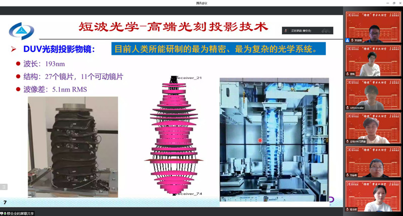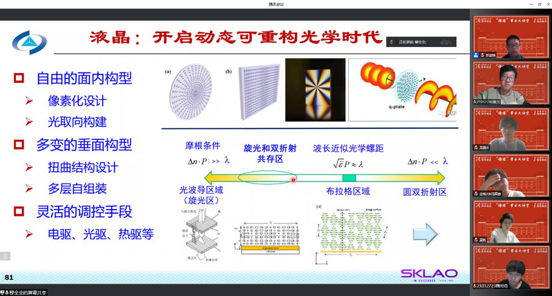 穆全全研究员以应用光学重点实验室研发光刻机涉及到的光学元器件和光学问题作为切入点,从光学器件的发展与变迁出发,围绕液晶光学调控技术领域,详细介绍了实验室近年来在液晶相位调控与自适应光学应用以及液晶PB相位超表面器件及其应用等领域所取得的研究成果。
