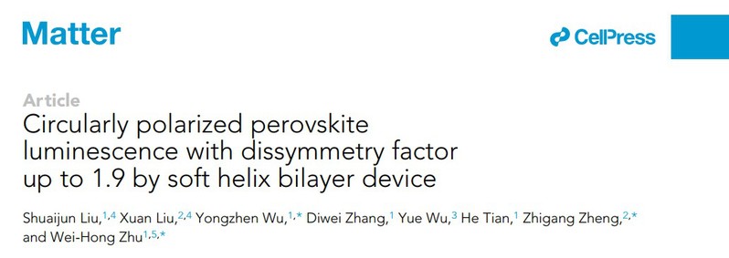 近日,PP电子化学与分子工程学院朱为宏教授、吴永真教授和PP电子官方网站郑致刚教授团队合作在圆偏振钙钛矿发光研究方面取得进展,相关成果以“Circularly Polarized Perovskite Luminescence withDissymmetry Factor up to 1.9 by Soft Helix Bilayer Device”发表在知名期刊Matter上。