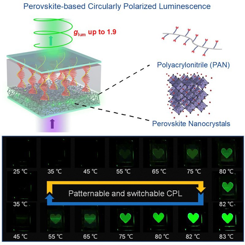 圆偏振发光(CPL)是指发光体系发射出具有差异的左旋和右旋圆偏振光的现象,其在三维显示、生物传感、加密防伪、光催化不对称合成等领域具有广泛的应用前景。金属卤化物钙钛矿材料具有荧光量子效率高、发射峰窄、发射波长可调等优异特性,有望成为理想的CPL新材料。目前,已报道的钙钛矿CPL材料,如手性二维钙钛矿、手性配体修饰钙钛矿纳米晶等存在不对称因子(glum值)小、发光效率低等问题,并且其稳定性很少被研究,严重限制了其实际应用。将钙钛矿纳米晶掺入手性向列相液晶能够显著提高CPL的glum值,但是该混合体系不仅会严重破坏钙钛矿的结构稳定性,还会影响液晶分子的有序排列,减弱其对光的圆偏振调制能力。因此,如何获得具有高发光效率和高glum值的CPL仍然是研究人员需要面对的巨大挑战。